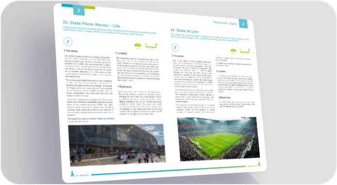 2 Venues and Legacy 2 33. Stade Pierre-Mauroy - Lille 34. Stade de Lyon Designed as an ultra-modern sports facility, the Stade Pierre-Mauroy is architecturally The Stade de Lyon has been designed as a state-of-the-art multi-purpose arena impressive, with a unique ability to transform and cutting-edge features. which can easily adapt to the constantly evolving spectator expectations. 50,000 1h by train 58,000 2h by train I The venue I Location I The venue pitch was designed based on the latest innovative grass technology. Lille claims its place as the fourth largest metropolitan The Stade Pierre-Mauroy is located 6 km east of the Lyon is the capital of the Auvergne-Rhone-Alpes The Stade de Lyon will host Football competitions for area (1.9 million residents) in France. With 36% of the city centre. Lille can be reached from Paris by rail region, near the French Alps. It is the third largest city the Olympic Games. population aged under 25, Lille is a vibrant, young and (1h10). Thanks to its strategic location at the heart of in France and an important geographical crossroad dynamic city. In 2004, Lille was named the European the European rail network, the city is also within easy of Europe. The city is known for its historical and Capital of Culture and obtained the title of City of Art reach of London (1h20), Brussels (0:35) and Amsterdam architectural landmarks and is a UNESCO World I Location and History. The city has hence underlined its status (2h40). The venue, located 5 km from the Lille-Lesquin Heritage site. Since the late 20th century, it has as an excellent destination for culture and tourism, International Airport, is accessible by car via highways developed a reputation as the capital of gastronomy The stadium is located 18 km east of the city centre confirming its position on the European map of tourism A1, A23 and A27. In addition, it benefits from regular in France and in the world. From an economic point of of Lyon, in the east of France. Lyon can be reached and trade events. bus service as well as multiple rail connections through view, Lyon is an attractive, dynamic city thanks to easy from Paris by train (1h50). The venue, which is located The multipurpose Stade Pierre-Mauroy was completed Metro lines 1 and 2. access from all over Europe, the availability of qualified 10 km from the Lyon-Saint Exupery Airport (1h10 by in 2012. The Stade Pierre-Mauroy is known for its workforce and research centres and the development plane from Paris), is easily accessible either by car via flexibility and state-of-the-art technology. For Football I Experience of a thriving IT services industry. highways (A7, A432) or by tram (line 3 in particular and Rugby events, the lower and upper seating bowls The brand new Stade de Lyon opened in January 2016 connects the stadium to both train stations and the can accommodate up to 50,000 spectators. For its based on a design by the architectural firm Populous. airport). In the three years since completion, the Stade Pierre- indoor configuration, the venue roof can cover the Mauroy has hosted a number of important events, The impressive, multipurpose complex features a stadium in thirty minutes. including the 2014 Davis Cup finals between France state-of-the-art pitch, ample athlete preparation and I Experience 2 The pitch is equipped with a hydraulic lift and massive and Switzerland, where a record was broken for the media areas, hotels, restaurants and over 8,000 m of tracks and is therefore retractable, enabling a smaller highest attendance ever for an officially-sanctioned exhibition space. Opened in 2016, upcoming large-scale events at the arena to be created using the 30,000 seat upper competition tennis match. The venue also hosted The stadium’s environmental impact is moderated venue include UEFA European Championships 2016 bowl for tennis and extreme sports events as well as the Eurobasket finals in 2015 with its indoor arena thanks to solar panels installed on the roof, a natural and FIFA Women’s World Cup 2019. concerts. Solar panels and wind turbines installed on configuration. Future large-scale events at the venue ventilation system and the capability to recycle the roof help to significantly reduce the venue’s carbon include UEFA European Championships 2016 and IHF rainwater for irrigation purposes. The natural grass footprint. World Men’s Handball Championships 2017. The Stade Pierre-Mauroy will host Football competitions for the Olympic Games. 52 - PARIS 2024 PARIS 2024 - 53