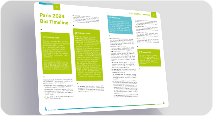 3 - Paris 2024 bid committee 3 12th September rd 3 June 2015, a French Delegation is received in - in line to host football preliminaries, should Paris host Paris 2024 Lausanne by the IOC, within the framework of a the letter officialising the Paris the Games. These venues are Paris (Parc des Princes) new phase of the bidding procedure known as the Bordeaux, Lille, Lyon, Marseille, Nantes, Nice, Saint- “Invitation Phase”, allowing potential candidate cities bid for the 2024 Olympic and Etienne and Toulouse. to have discussions with the IOC. Paralympic Games, jointly signed st 21 January 2016, , the Paris 2024 bid committee Bid Timeline by Anne Hidalgo, the Mayor of signs its first partnership contract with La Française - Paris, and Denis Masseglia, the des Jeux (the French National lotteries and gaming President of CNOSF, is sent to agency). nd the IOC. 2 February2016, L’INSEP (the French national - high-performance sports institute) confirms its th commitment to Paris 2024 in a contract signed with 12 February 2015 - the bid committee. . - nd 8 February 2016, the Paris 2024 bid committee Bernard Lapasset, Chairman th 16 September 2015, the IOC publishes the official announces the signing of four new commercial 12th February 2015 of the Association Ambition list of the five cities bidding to host the 2024 Olympic partners: Caisse de Dépôts, Elior, JCDecaux and - Olympique et Paralympique, Tony and Paralympic Games. Budapest, Hamburg, Los RATP . Bernard Lapasset, the Chairman Estanguet, co-Chairman, member Angeles and Rome are Paris’ four other cities engaged of the French International Sports of the IOC and triple Olympic in the two-year campaign th - Committee (CFSI), submits champion, Guy Drut, CIO 25 September 2015, the CNOSF launches a public an in-depth feasibility study member, Anne Hidalgo, Mayor of engagement campaign, “Je rêve des Jeux” (“I dream into a possible Paris 20242 Paris, Denis Masseglia, President of the Games”), in support of the Paris 2024 bid. th 9th February 2016 bid to representatives of the of the French National Olympic 5 November 2015, the Board of Directors of the sports community, the national Committee (CNOSF), Emmanuelle Association Ambition Olympique et Paralympique - designates Pleyel - Bords de Seine as the site of the Paris 2024 bid committee government and relevant local Assmann, President of the French the future Olympic and Paralympic Village should officially unveils its logo. At authorities. National Paralympic Committee, Paris be successful in its bid. Dugny – Le Bourget is 20.24 (8.24pm) it is projected Jean-Paul Huchon, President consequently confirmed as the location for the Media onto the Arc de Triomphe Following this study, an of the Ile-De-France Region, Village. before the eyes of France and th th association is created with the Patrick Kanner, Minister for 18 and 19 November 2015, the International the world. role of developing a potential Urban Affairs, Youth and Sports, Paralympic Committee (IPC) and the IOC host a workshop in Lausanne for the cities bidding for the bid for the right to host the 2024 Thierry Braillard, Secretary of 2024 Olympic and Paralympic Games. Olympic and Paralympic Games. State for Sports, announce, in the th - 4 December 2015, Tony Estanguet, co-Chairman of presence of a hundred French the Paris 2024 bid committee, participates as a guest international athletes, the official speaker at the Paris COP21. Paris Candidature for the 2024 13th December 2015, the Association Ambition - Olympic and Paralympic Games. Olympique et Paralympique working group is officially transformed into the new “Paris 2024” Public Interest Following this study, an association is created with the Group (GIP). role of developing a potential bid for the right to host th the 2024 Olympic and Paralympic Games. Le 18 December 2015, the newly created GIP Paris - 2024 brings its key stakeholders together for the first nd 2 April 2015, a new organisation, the Association time. This meeting results in the creation of an Athletes’ “Ambition Olympique et Paralympique” is formed. 7th September 2015, the Board of directors of the Committee, whose role will be to participate in the th Association Ambition Olympique et Paralympique development of Games plans; lead bid promotion; 13 April 2015, a significant majority of the Paris designates the city of Marseille as the venue for the and engage the sports community. The Commission City Council vote in favour of a Paris bid to secure Olympic sailing events, if Paris is successful in its bid. will be co-chaired by the Olympic Champion n Judo the right to host the 2024 Olympic and Paralympic Teddy Riner and Paralympic Champion in Athletics Summer Games. Marie-Amélie Le Fur. th 7 May 2015, the Ile-De-France Regional Council th votes in favour of the project. Le 18 December 2015, the Board of Directors of GIP Paris 2024 announces the pre-selection of nine sites 62 - PARIS 2024 PARIS 2024 - 63