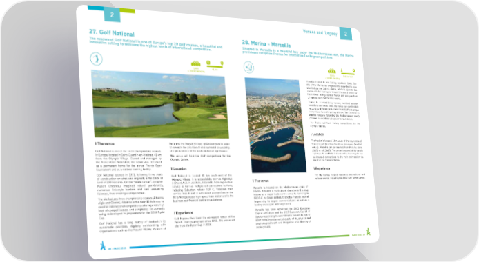 2 Venues and Legacy 2 27. Golf National 28. Marina - Marseille The renowned Golf National is one of Europe's top 20 golf courses, a beautiful and Situated in Marseille in a beautiful bay under the Mediterranean sun, the Marina innovative setting to welcome the highest levels of international competition. providesan exceptional venue for international sailing competitions. 5,000 41 km 5,000 3h10 by train + 30,000 standing + 10,000 standing Marseille hosted its first Sailing regatta in 1846. The site of the Marina has progressively expanded to now also include the Sailing centre, which is open to the community for training or leisure. It is also a centre for the national sailing team of France and a regular host of national and international events. Thanks to its modularity, spread, excellent weather conditions and weak tides, the venue can comfortably respond to different race scenarios and offer a unique competition for participating athletes. The Corniche (a seaside roadway following the Mediterranean coast) provides an excellent viewpoint for spectators. The Marina will host Sailing competitions for the Olympic Games. I Location The Marina is located 5 km south of the city centre of I The venue Paris and the French Ministry of Environment in order Marseille and 3 km from the Stade Velodrome (Football to advance the priorities of environmental stewardship venue). Marseille can be reached from Paris by plane Golf National is one of the finest championship courses and preservation of the land’s historical significance. (1h15) or rail (3h00). The venue is accessible by car via in Europe, located in Saint-Quentin-en-Yvelines, 41 km highways A7 and A55. It also benefits from regular bus The venue will host the Golf competitions for the service and connections to the main train station via from the Olympic Village. Owned and managed by Olympic Games. line 2 of the Marseille Metro. the French Golf Federation, the venue was conceived as a permanent home for the annual French Open tournament and as a national training facility. I Location I Experience Golf National opened in 1991, following three years Golf National is located 41 km south-west of the of construction on what was originally a flat piece of The Marina has hosted numerous international and land of 139 hectares. On this “blank canvas”, designer Olympic Village. It is accessibleby car via highways I The venue national events, including the 2002 ISAF World Games. Hubert Chesneau imagined natural grandstands, A12 and A13. In addition, it benefits from regular bus numerous link-style bunkers and vast undulating service as well as multiple rail connections to Paris, including Suburban railway RER C, Transilien train Marseille is located on the Mediterranean coast of fairways, thus creating a unique venue. service lines N and U with direct connections to the France. It boasts a multicultural character and a long The site features three championship courses (Albatros, Paris Montparnasse high-speed train station and to the history as a major trade centre since its founding in Aigle and Oiselet). Albatros is the main 18-hole course business and financial centre of La Defense. 600 B.C. by Greek settlers. It is today France's second used for international competitions, offering a very high largest city, its largest commercial port as well as a level of competitiveness and complexity. It is currently leading cruise port and freight port. being redeveloped in preparation for the 2018 Ryder I Experience Marseille has been appointed the 2013 European Cup. Capital of Culture and the 2017 European Capital of Golf National has a long history of dedication to Golf National has been the permanent venue of the Sport, recognising its commitments toward the role of sustainable practices, regularly collaborating with French Open tournament since 1991. The venue will sport in the improvement of quality of life, physical and organisations such as the Natural History Museum of also host the Ryder Cup in 2018. psychological health and integration of a diversity of social groups. 46 - PARIS 2024 PARIS 2024 - 47