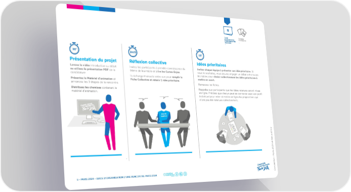 R M - - GUIDE MATÉRIEL D’ORGANISATION D’ANIMATION D’UNE RENCONTRE - PARIS 2024 - 30’ 1h15 15’ Présentation du projet Réflexion collective Idées prioritaires Lancez la vidéo introductive au débat Invitez les participants à prendre connaissance du Invitez chaque équipe à présenter son idée prioritaire. Si ou utilisez la présentation PDF de la thème de leur table et à lire les Cartes Enjeu. vous le souhaitez, vous pouvez engager un débat entre toutes candidature Ils échangent ensuite entre eux pour remplir la les tables pour choisir collectivement les idées prioritaires à Présentez le Matériel d’animation et Fiche Collective et retenir 1 idée prioritaire. mettre en avant. annoncez les 3 étapes de la rencontre. Ramassez les fiches. Distribuez les chemises contenant le Rappelez aux participants que les idées retenues seront mises matériel d’animation. en ligne. Précisez que chacun peut se connecter avec son profil individuel pour voter et mettre en ligne les propositions qui n’ont pas été retenues collectivement. PORTE PAROLE divid nI elleu e hciF ? he e ic v i F t llec Co e ll e ue ch id i i v che F i In nd div I ica idu e ll e bl ? ? es pu ? t R ris 2024 e a tion : P Ensemble ep onstruisons c 6 - PARIS 2024 - GUIDE D’ORGANISATION D’UNE RENCONTRE PARIS 2024 Conc