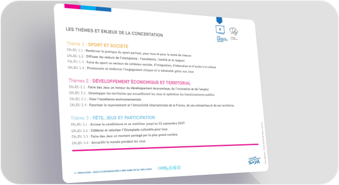 R M - - 3 GUIDE MATÉRIEL D’ORGANISATION D’ANIMATION LES THÈMES ET ENJEUX DE LA CONCERTATION D’UNE RENCONTRE - PARIS 2024 - Thème 1 : SPORT ET SOCIÉTÉ ENJEU 1.1 : Renforcer la pratique du sport partout, pour tous et pour la santé de chacun ENJEU 1.2 : Diffuser les valeurs de l’olympisme : l’excellence, l’amitié et le respect ENJEU 1.3 : Faire du sport un vecteur de cohésion sociale, d’intégration, d’éducation et d’accès à la culture ENJEU 1.4 : Promouvoir et renforcer l’engagement citoyen et le bénévolat grâce aux Jeux Thèmes 2 : DÉVELOPPEMENT ÉCONOMIQUE ET TERRITORIAL ENJEU 2.1 : Faire des Jeux un moteur du développement économique, de l’innovation et de l’emploi ENJEU 2.2 : Développer les territoires qui accueilleront les Jeux et optimiser les investissements publics ENJEU 2.3 : Viser l’excellence environnementale ENJEU 2.4 : Favoriser le rayonnement et l’attractivité internationale de la France, de ses entreprises et de ses territoires Thème 3 : FÊTE, JEUX ET PARTICIPATION ENJEU 3.1 : Animer la candidature et se mobiliser jusqu’au 13 septembre 2017 ica ENJEU 3.2 : Célébrer et valoriser l’Olympiade culturelle pour tous bl ENJEU 3.3 : Faire des Jeux un moment partagé par le plus grand nombre es pu t R ENJEU 3.4 : Accueillir le monde pendant les Jeux ris 2024 e a tion : P Ensemble ep onstruisons c 3 - PARIS 2024 - GUIDE D’ORGANISATION D’UNE RENCONTRE PARIS 2024 Conc