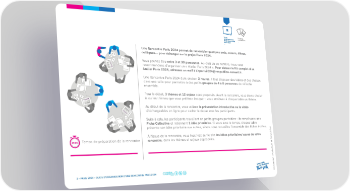 R M 3 - - GUIDE MATÉRIEL D’ORGANISATION D’ANIMATION D’UNE RENCONTRE - PARIS 2024 - 2 Une Rencontre Paris 2024 permet de rassembler quelques amis, voisins, élèves, collègues... pour échanger sur le projet Paris 2024. ? ? ? F ic h I e n di vi duel ? le Vous pouvez être entre 3 et 30 personnes. Au-delà de ce nombre, nous vous t men rge Ema Fich e C ol l ective recommandons d’organiser un « Atelier Paris 2024 ». Pour obtenir le Kit complet d’un Atelier Paris 2024, adressez un mail à [email protected]. Une Rencontre Paris 2024 dure environ 2 heures. Il faut disposer des tables et des chaises e dans une salle pour permettre à des petits groupes de 4 à 8 personnes de réfléchir iv e ct ch lle i o le F C ensemble. el u e d i h v c i Fi nd I ? Pour le débat, 3 thèmes et 12 enjeux sont proposés. Avant la rencontre, vous devez choisir ? ? le ou les thèmes que vous préférez évoquer : vous attribuez à chaque table un thème. ? t n e m e g r a m E Au début de la rencontre, vous utilisez la présentation introductive ou la vidéo m E téléchargeables en ligne pour cadrer le débat avec les participants. g r a e m e t n ? l o C ? ? ? Suite à cela, les participants travaillent en petits groupes par tables : ils remplissent une t c e l c i F e v i e h n I u d i v i d e l l e e h c i F Fiche Collective et retiennent 1 idée prioritaire. Si vous avez le temps, chaque table présente son idée prioritaire aux autres, sinon, vous recueillez l’ensemble des fiches écrites. ica bl À l’issue de la rencontre, vous inscrivez sur le site les idées prioritaires issues de votre es pu 2h00 Temps de préparation de la rencontre rencontre, dans les thèmes et enjeux appropriés. t R ris 2024 e a tion : P ble ep Ensem isons onstru c 2 - PARIS 2024 - GUIDE D’ORGANISATION D’UNE RENCONTRE PARIS 2024 Conc